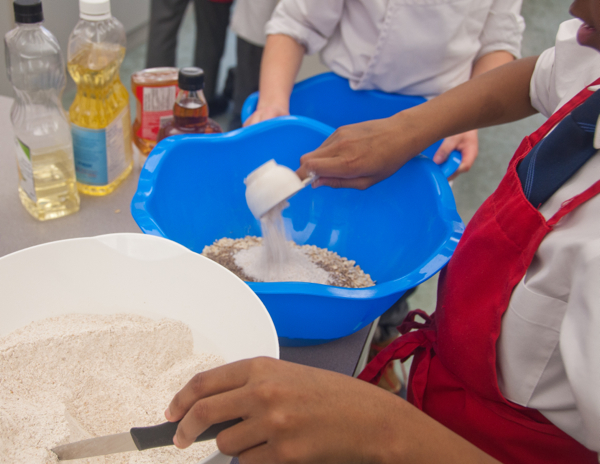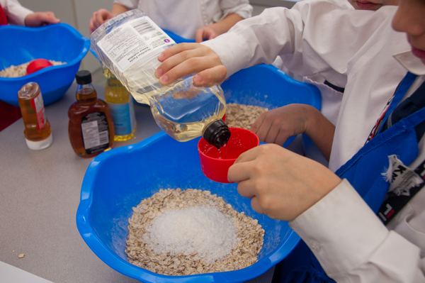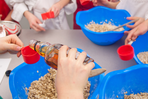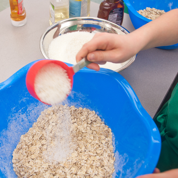 The last week of school before a much-needed “Spring” break. (I use the term “Spring” loosely since it’s so cold still!). It’s a tough week for everyone – students and teachers (and I am betting parents too!). What better way to keep almost-spring energy in check than to get kids in the kitchen – in this case, the science lab, baking up a batch of Jennifer Tyler Lee’s “Power (granola) Bars” – with chocolate!