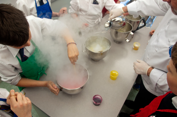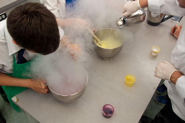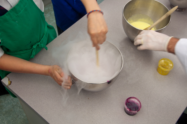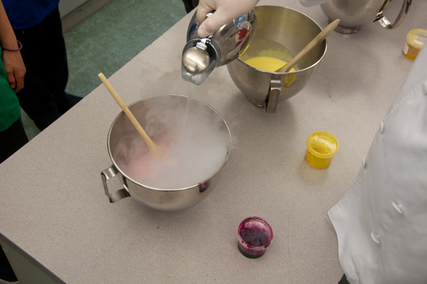 Meanwhile, over at “liquid nitrogen central” the boys were hard at work making their ice cream base into ice cream…