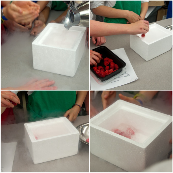 The boys also used liquid nitrogen to make “raspberry niblets”. We took regular raspberries and gently placed them in a liquid nitrogen bath until they crackled and popped and hardened. Then we crushed them between two bowls…