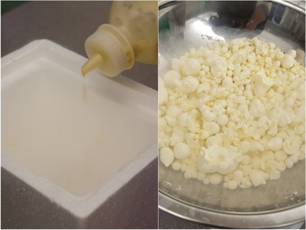 And took a little vanilla and placed it in a squeeze bottle so that the boys could make “ice cream pearls” (or “chunks” as some of the more enthusiastically dropped-into-liquid-nitrogen drops turned out!). We let the drops sit in a liquid nitrogen bath until they hardened up, then carefully removed them (well, John did) and let them warm up a little so they didn’t “burn” our mouths…