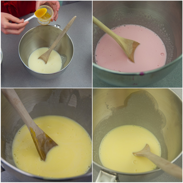After 9 minutes, we separated the mixture into three bowls and added some flavours – bubblegum, pineapple and banana…