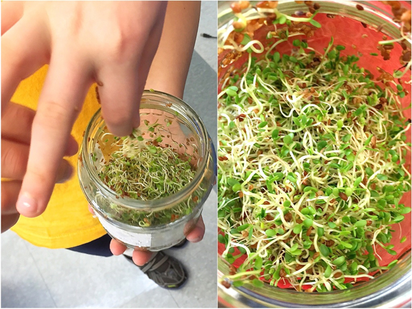 A.Vogel Canada generously supported Food Revolution Ambassadors across Canada this Food Revolution Day by providing sprouting kits to get kids growing their food and my students were fortunate enough to receive 2-3 of the sprouting jars and alfalfa seeds. They were absolutely entranced with their progress over the week leading up to Food Revolution Day and when they were finally ready to eat, many of the boys snacked on them just like they would chips or candy. I let my Grade 5s taste the sprouts at the beginning of one of my French classes and they couldn’t stop eating them. I didn’t react (as in “Wow you guys are eating and liking vegetables!”) and they just kept on eating them. A whole jar, in fact!