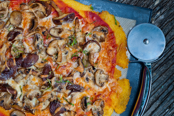 Here’s a gluten-free, vegetarian pizza – starring mushrooms, with a polenta crust.