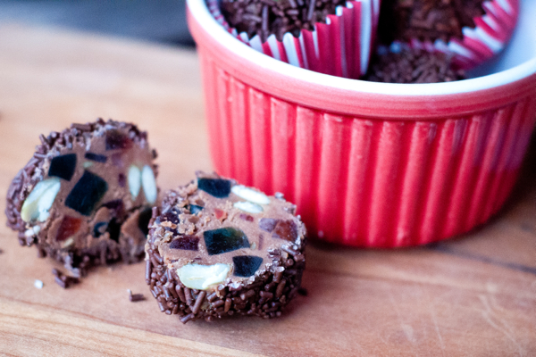 My last offering for the holiday sweets table is festive fruit and nut truffles. This is a mouthful of flavour with interesting textures – I love the contrast of the pumpkin seeds and the soft fruit inside and the crunch of the chocolate sprinkles on the outside (I like to use these ones* that I happen to have brought back from Europe but any chocolate sprinkles will be fine!) – this is perfect with a milk chocolate as the base inside because milk tends to be sweeter but it works with the nuts/ fruit which are not.
