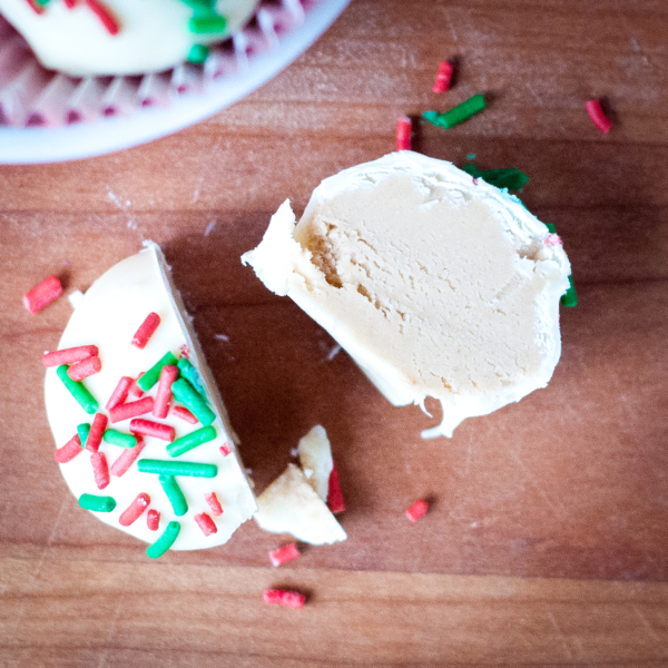 Next I created cookie butter (speculoos) truffles. I like to use a smooth cookie butter (like this one*) for this recipe so the interior of the truffle is velvety. It’s a lovely nod to gingerbread for the holidays but quite frankly, you could make these anytime of the year for any type of party and I think you’d be very popular. I dipped this in a white chocolate coating to match the pale interior (and, of course, topped it with Christmas-y sprinkles!).