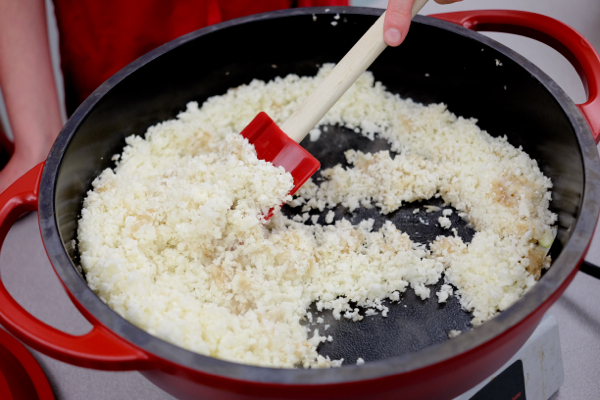 - In a large skillet heat the oil over medium-high heat and add the cauliflower/ onion/ garlic mixture. Saute for a couple of minutes then add the spices and continue to cook over medium heat until fragrant.