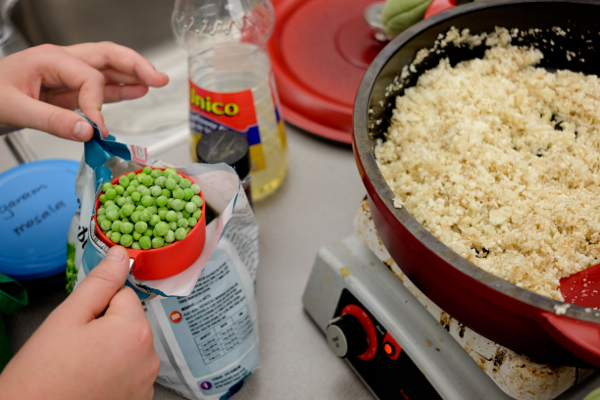 We had lots of potatoes leftover from last week’s Super Green Soup so I wanted to use those up instead of buying the sweet potato the recipe called for. I also wanted to find a solution that would work for my vegetarian club members instead of the beef. I decided to substitute some “riced cauliflower” and peas for the beef and rice in the original recipe – having had potato and pea samosas before, I figured this would be a good combination. I talked the boys through these decisions as we worked – I think it’s SO important to teach them not only to cook but also to problem solve in the kitchen. I know many adults who would look at a recipe and think “I can’t make this because I am missing X ingredient” so I think it’s always good to show substitutes and other ways of making a dish when you don’t exactly have ALL the ingredients. Of course, that requires a little knowledge of what makes a good substitute and of what flavours work well together but that comes from a bit of living and learning – kitchen experience which, hopefully these guys are getting every week with me!