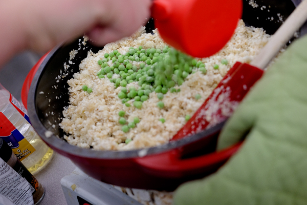 And the boys were thrilled to see that we chopped the cauliflower, garlic and onion in the food processor to make “rice”. SO much easier and way less tears!
