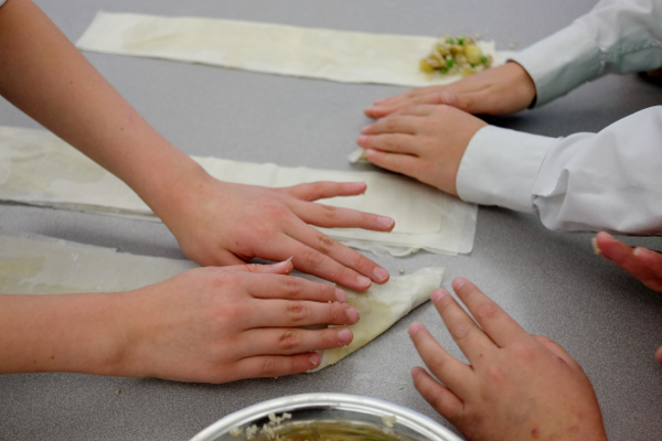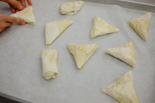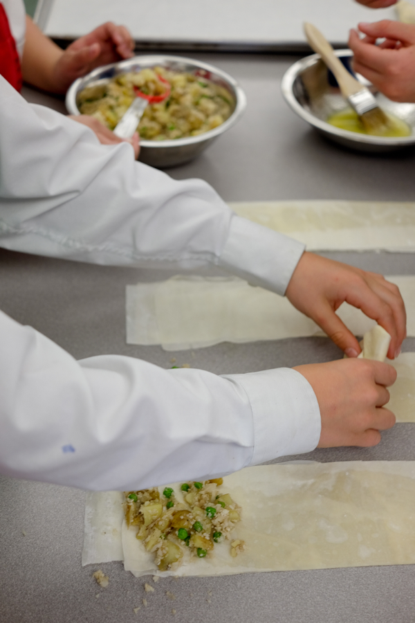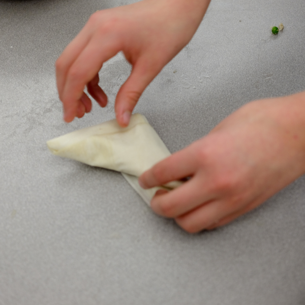 And then we got folding. I’ve made samosas once before with the boys when Charmian Christie came to work with the boys on sweet potato samosas so I kinda sorta remembered the folding (though now I realise she did it a bit differently). In any case, armed with brushes and melted butter and one large knife, we managed pretty well, I’d say!