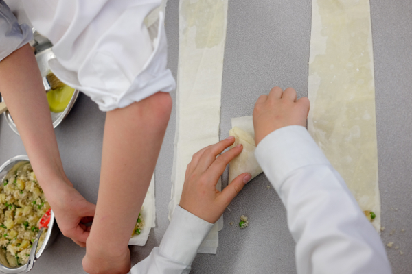 - Place one rounded tablespoon of the filling mixture at one end of the strip, leaving a border of around 2cm.
