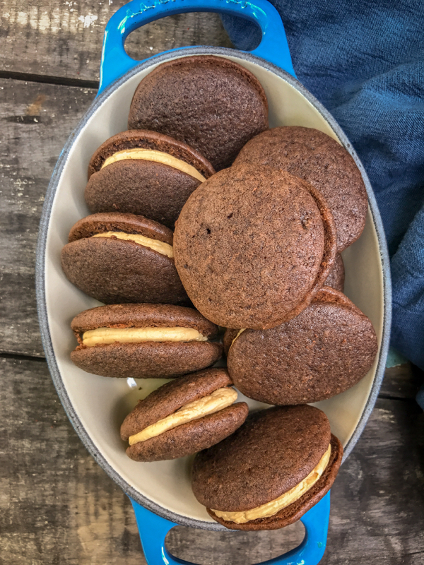 If you can believe it, I’ve never made a whoopie pie before, in fact, I don’t think I have ever eaten one come to think of it! they are spongey (but denser than a sponge cake) sticky sandwich cakes – Dorie’s version uses a creamy peanut butter filling but I don’t happen to have any on hand so I used crunchy speculoos spread which made for a lovely crunch to counter the soft pillowy cakes and cream filling.