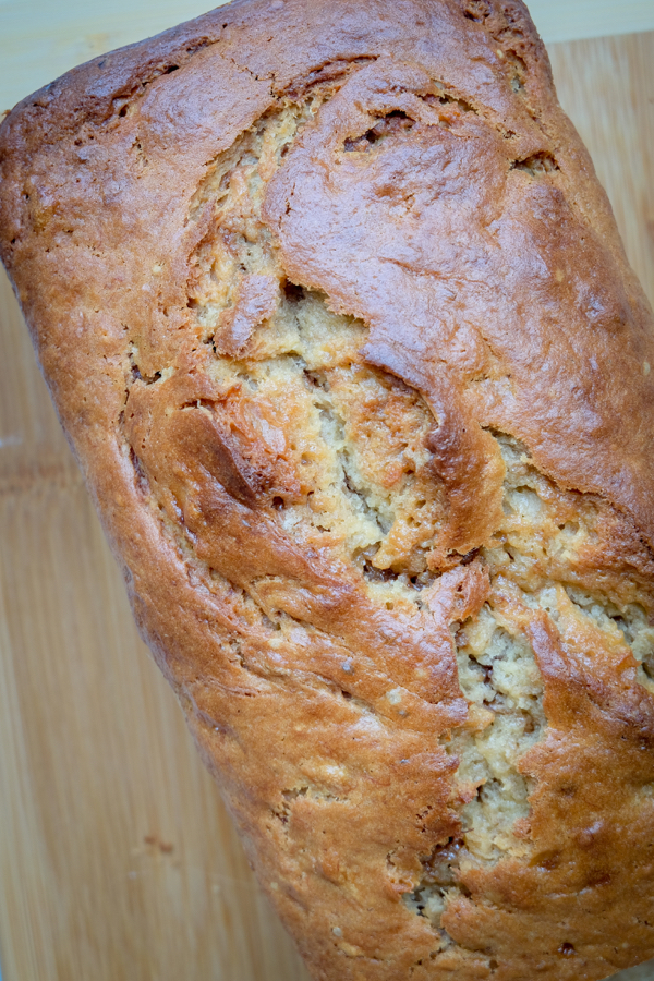 I experimented a few times with creating pretty patterns but found it was a little difficult because the spread is a little thick, so whatever you end up with is fine, as long as you distribute your spoonsful of the spread evenly through the loaf. It’s a nice, not-too-sweet change from your average banana bread with just a hint of hazelnuts and caramel.