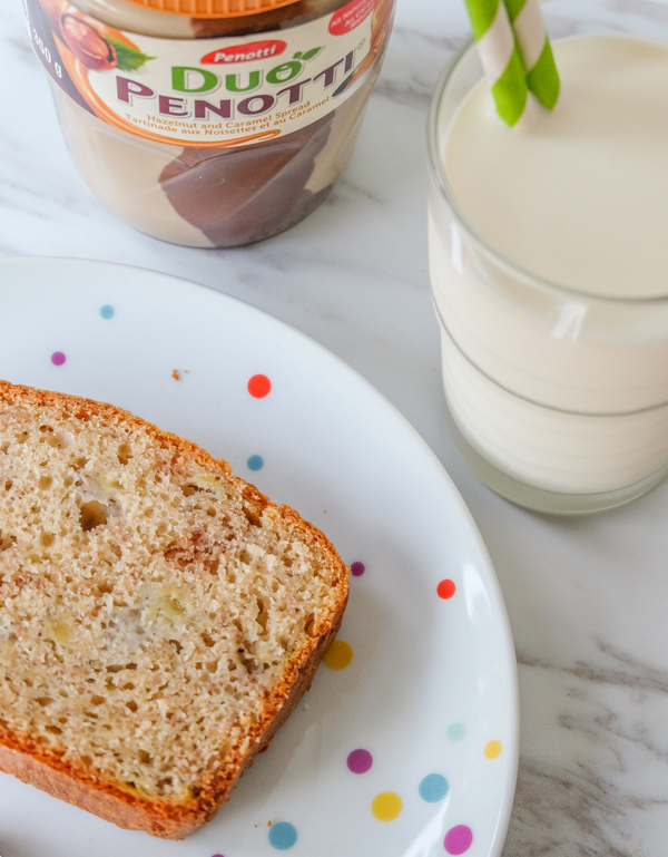 Recently I enjoyed some breakfast pancakes with caramelized bananas and thought the Duo Penotti would be great melted and drizzled on pancakes but then I got to thinking how great it would be to swirl it through banana bread. I’ve reduced the amount of sugar I’d typically use in banana bread because the spread itself is so sweet.