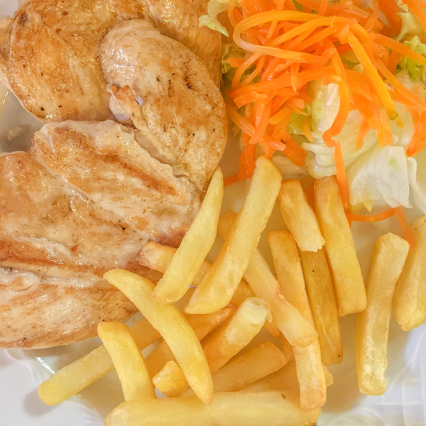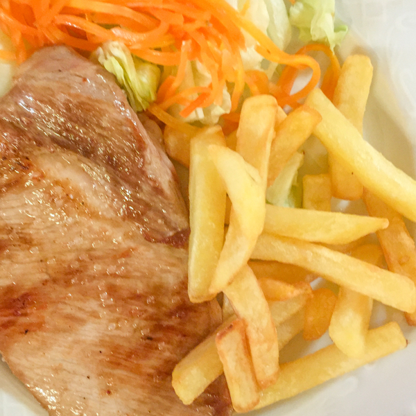 (simple grilled pork and chicken, a handful of chips and some “salad”)