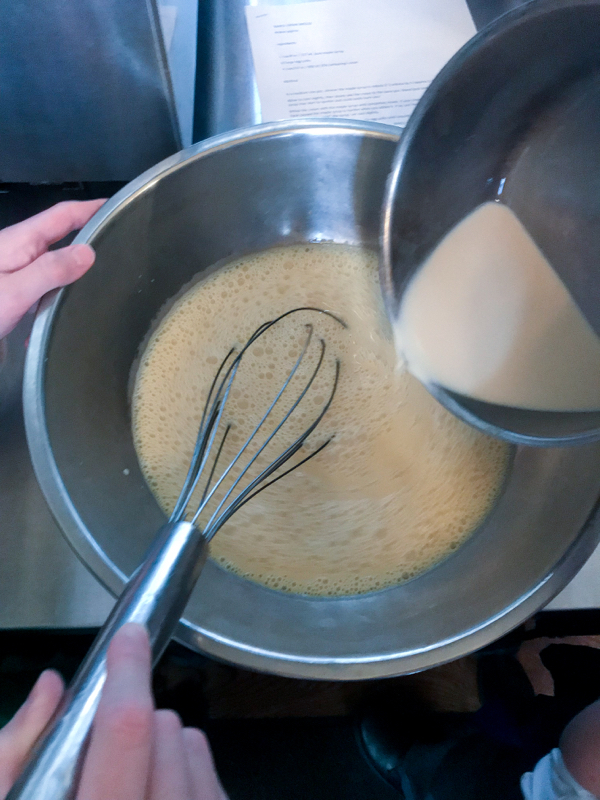 The boys did a great job with this – NO scrambled eggs in sight! We did strain the mixture though (it’s always best to – we caught a couple of pieces of shell!)…