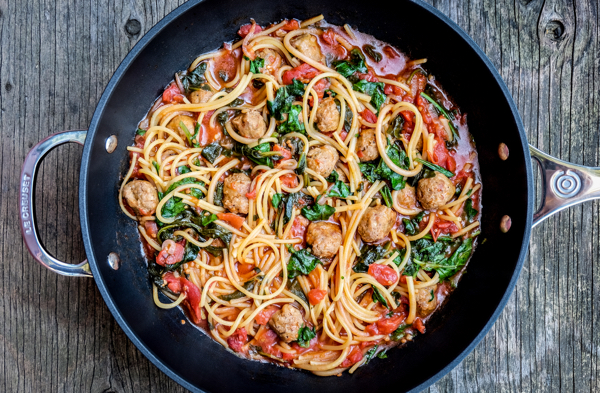 One pot spaghetti and sausage meatballs with tomatoes and kale