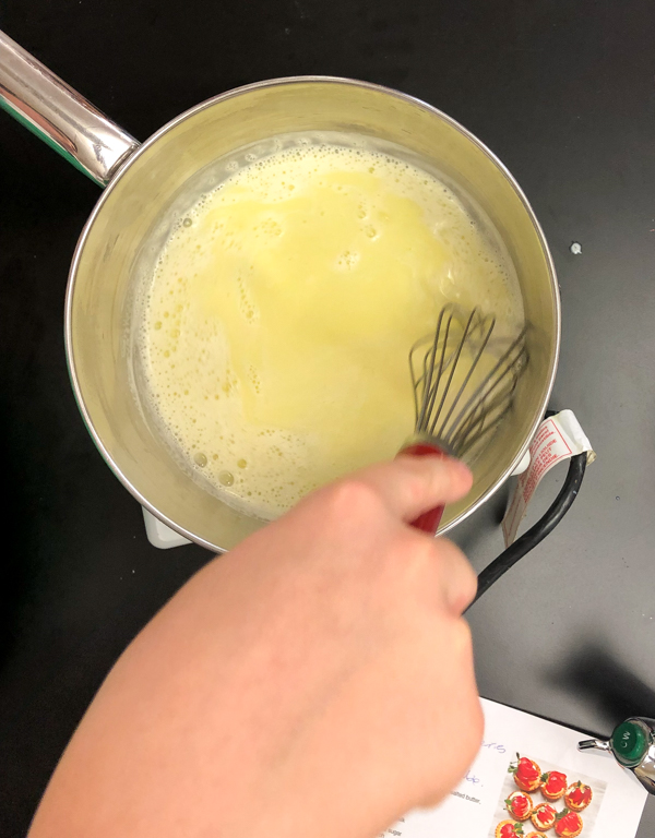 Meanwhile, as those baked, we got to making the crème pâtissière. I had made a batch of this earlier in the day to be sure we had some that was useable. It tends to thicken up pretty well as you cook it initially but does benefit from some time in the fridge. We made a 1/2 batch during class just to show the boys how to do it – and then we had some leftover to taste. #qualitycontrol, am I right?