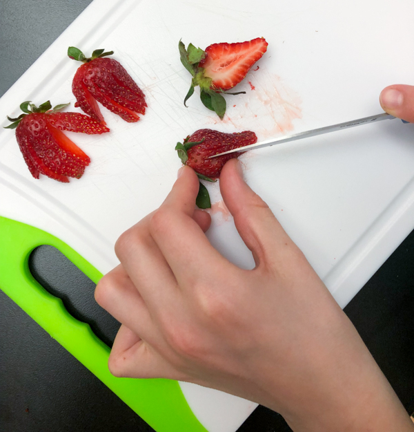 Pastry cream made (we learned how to push the cream through a metal sieve if there were lumps – a cool hack that can save your pastry cream if you take your eyes off it for 2 seconds – or if your hotplate is ridiculously hot as ours are in the STEM lab!), the boys got to the strawberries…