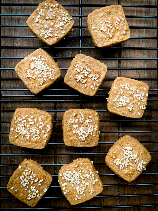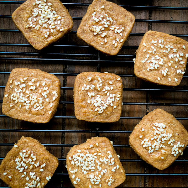 Black and white sesame seeds form a great-looking op-art mosaic on this cookie, no matter how you scatter them. But its true raison d’être is the taste, texture and cocktail compatibility. The taste is slightly sweet, definitely salty and just a touch rich because of the seeds; the texture is shortbready, with a little extra crumble because of the almond flour and a little extra crunch because of the sesame. The cookies compatibility is almost limitless: Try them with any white wine or champagne or pair them with vermouth or sherry and then bring them out again with the cheese course.