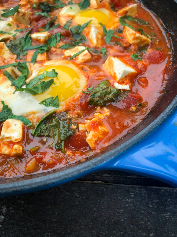 David’s version is onions, garlic and tomatoes (I used canned tomatoes) lightly spiced with paprika, caraway seeds, cumin and tumeric and gets a kick from chile pepper. Into the tomato base are added greens (I used baby kale) and cubes of feta which means that, with the eggs and some crusty baguette to mop up the delicious sauce, you’ve got a full meal for brunch, lunch or dinner. It’s the perfect recipe for those times you think you don’t have anything to eat in the house!