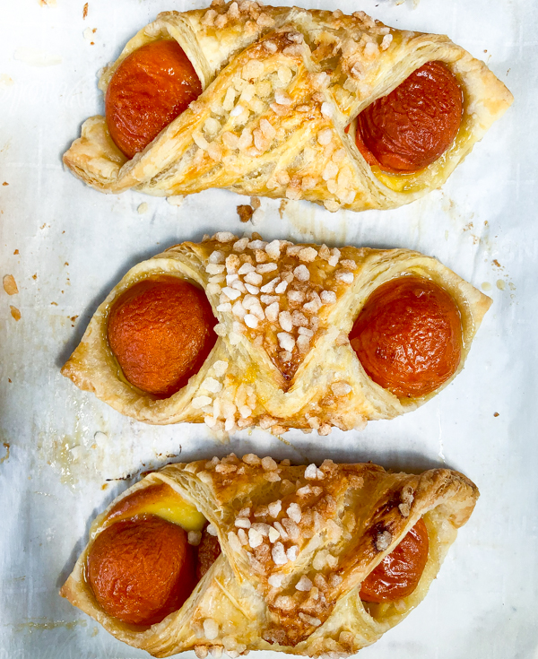 - Brush the whole pastry (not the apricots) with eggwash and sprinkle with a little pearl sugar.