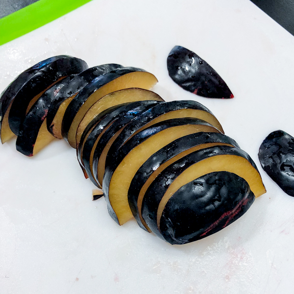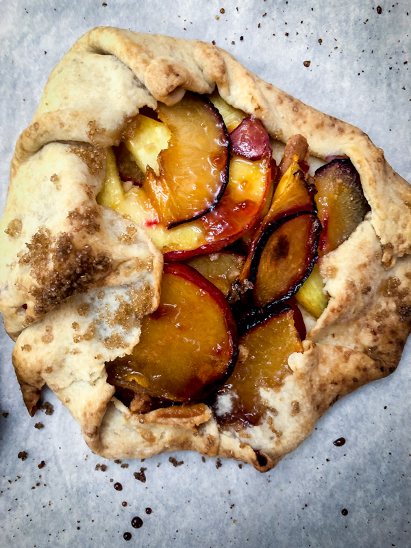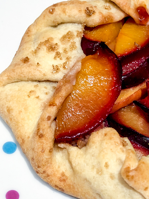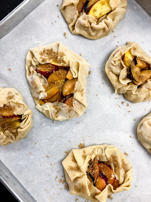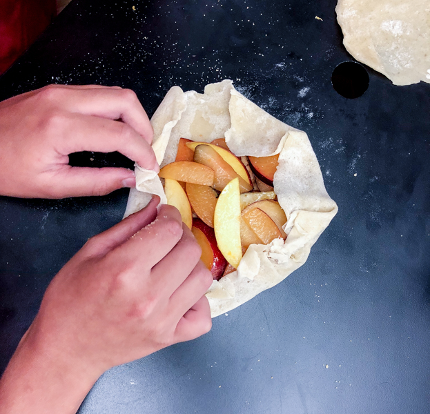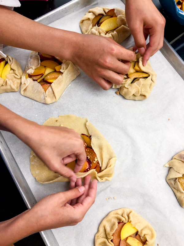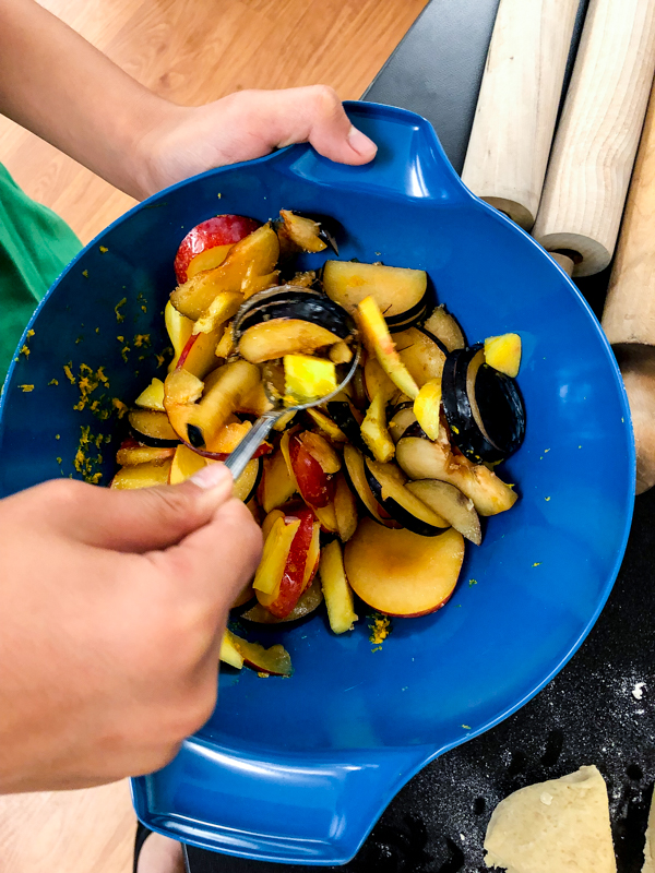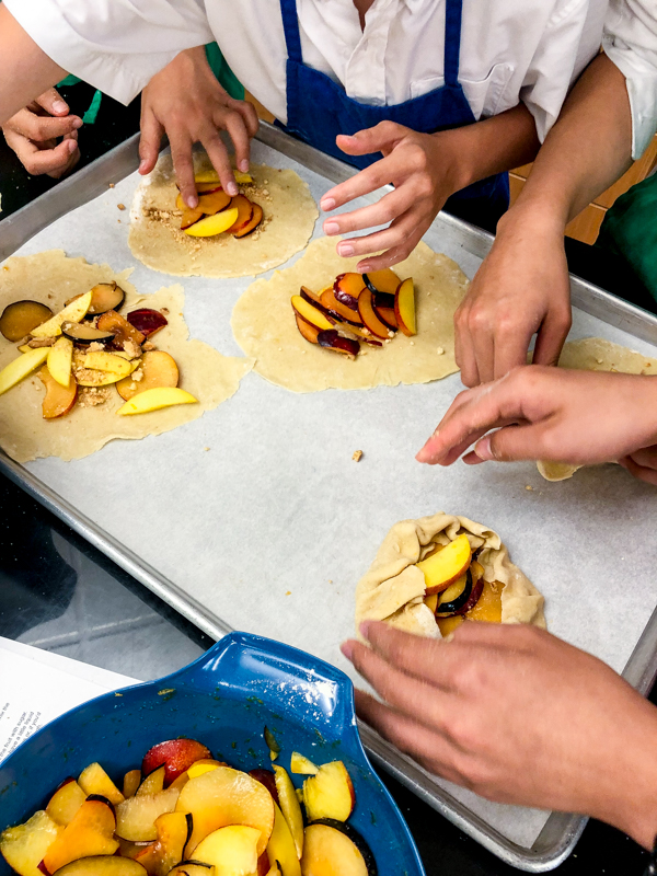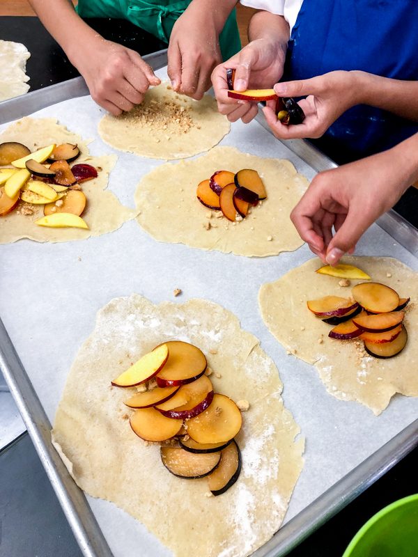We used black and red plums and peaches (and I had grapes but in the hustle to get this made in an hour, I forgot them – they made a nice snack as the galettes baked!) since fresh figs aren’t that easy to come by (recipe calls for plums, figs and grapes). I had thought I might use dried figs but couldn’t find any that were guaranteed nut-free so couldn’t bring them to school anyway. In any case, this “Fall” galette was more of a “late summer” variety but noone complained and some boys learned what a galette is (“Oh, it’s like a pie!” < loved hearing that lightbulb moment, love it when kids make cool food discoveries!). Of course we minified this dessert, making individual galettes so they would cook in time (around 25 minutes at 375˚F).