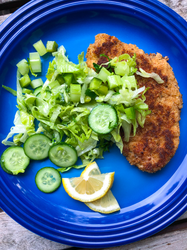 This is a great recipe that I have been making for many years, except the salad was on the side. However, when it comes to schnitzel, I will never forget ordering one in Austria along with spaezle and could not believe my eyes at the size. However, Jim and I ate it all.