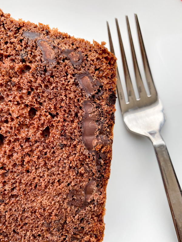 I’m also not sure what size my loaf pan is but it must be 9×5 because I didn’t have any problem with overflow. I still only baked the cake for 50 minutes; after finding a spot in the middle that wasn’t hitting chocolate, the cake was perfect.
