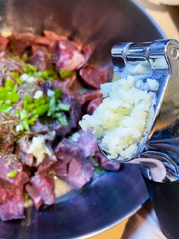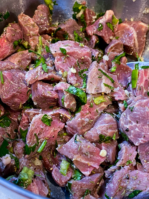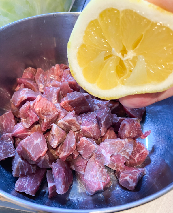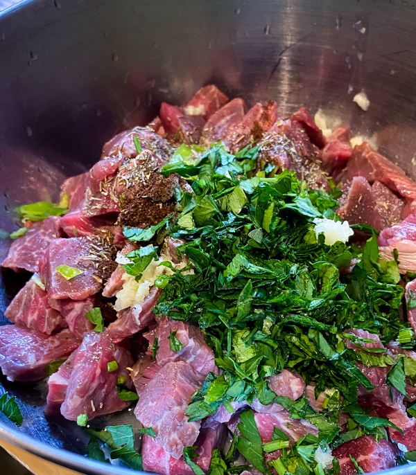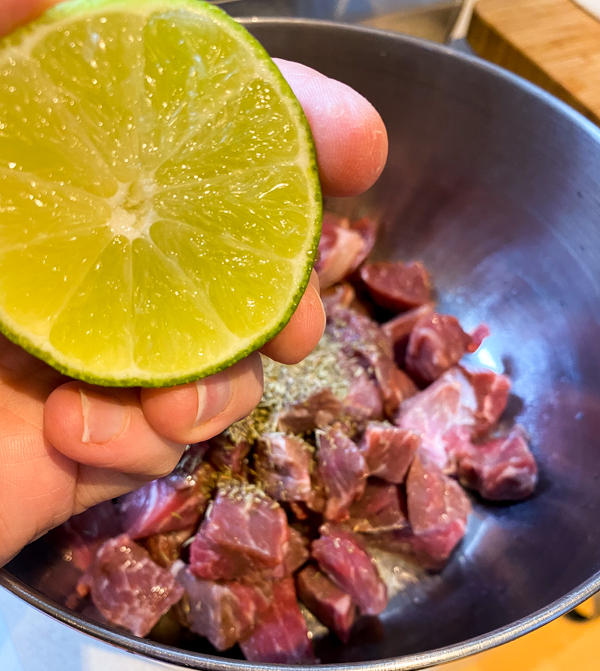 - Start by marinating the beef in a bowl with the lemon and lime juices, the pepper, garlic, spices, parsley, salt and pepper. Cover with plastic wrap and refrigerate 30 minutes while you cook and prepare the squash.