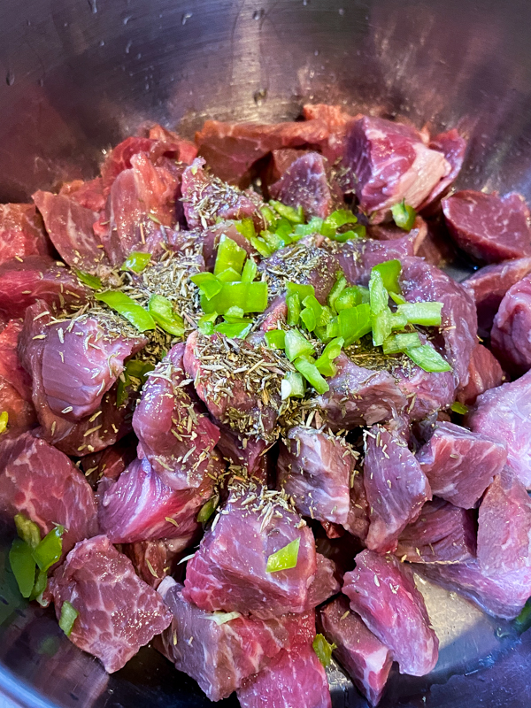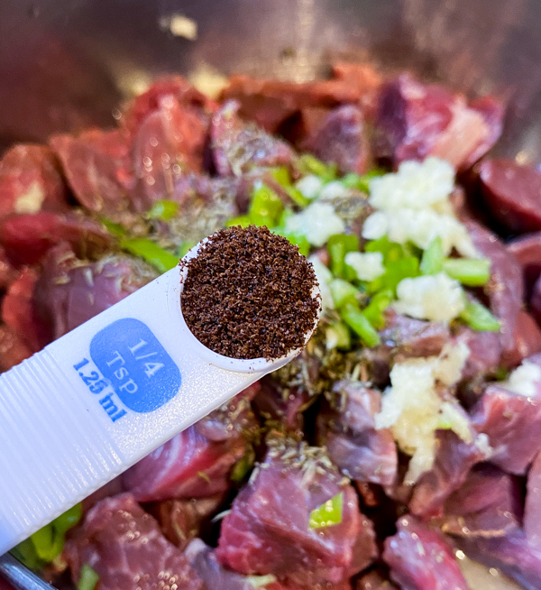 - Heat the oil in a large pot. Brown the beef (and the marinade) over medium-high heat (around 5 minutes).