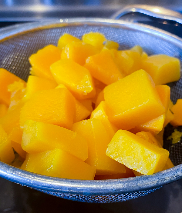 - Place the squash cubes in a large pot of water and bring to the boil. Cook until the squash is “fork tender” (it’s easily able to be mashed on the side of the pot with a fork). Drain the squash, put it back in the pot and mash with a fork or a potato masher.
