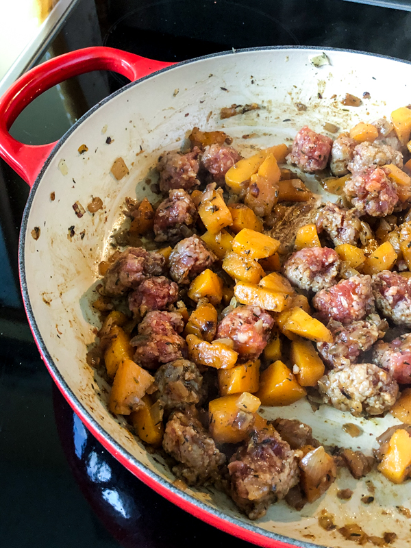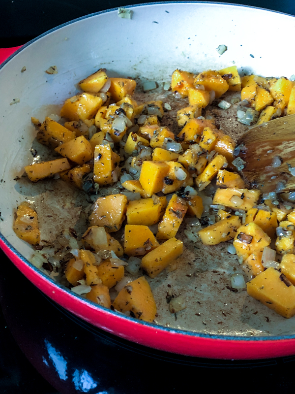 - Add the butternut squash cubes and cook approximately 3 minutes.