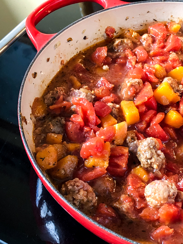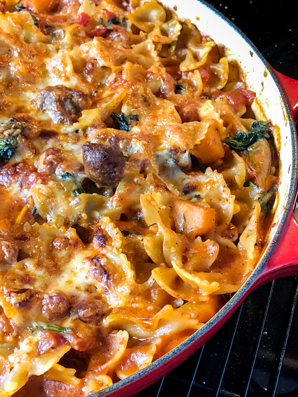 This dish was born of leftovers – leftover squash from my Soupe Joumou – and the contents of my pantry (always have canned, diced tomatoes on hand and had recently stocked up on canned beans), so when I saw Isabelle’s Sausage and Bean Pasta Bake on her blog recently, I bookmarked it for inspiration. I changed things up a bit but Isabelle’s recipe is a great base place to start!