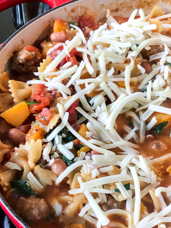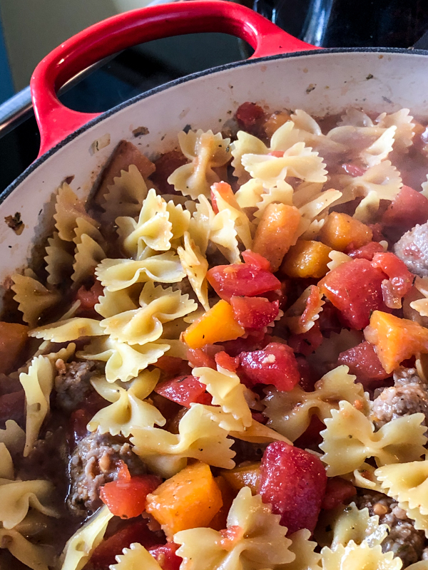 I love a good one-pan meal and, to be honest, it’s how I cook most of my pasta dishes these days. And most of the time, I have a few pantry and fridge staples on hand that will work together to make a complete meal in a pan with hardly any cleanup. These days, juggling online teaching, less prep time and less cleanup are my friends in the kitchen!