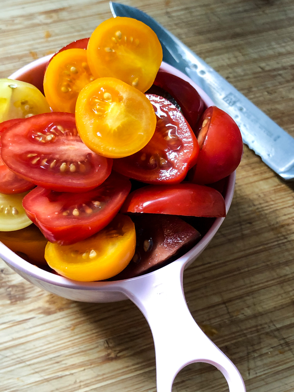 - Remove the lid, add the cherry tomatoes and beans, stirring to combine well.
