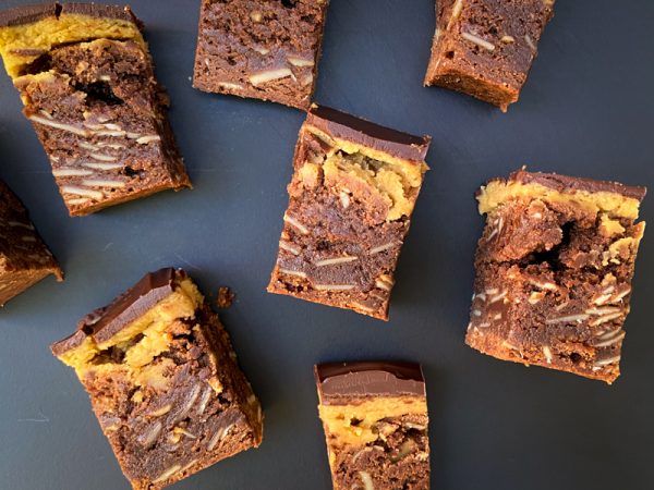 The taste? SO GOOD (if a little sweet. Dorie calls for the kind of peanut butter that has added sugar (I think, she says “not natural or old fashioned”) and I used natural almond butter with no added sugar and found the fudgey layer VERY sweet. Not sure I would add more sugar here if I make them again. Dorie’s full recipe says it makes 32 but they are VERY rich so I’d suggest even more (especially if they are proper brownie-height, not a loaf height LOL!).