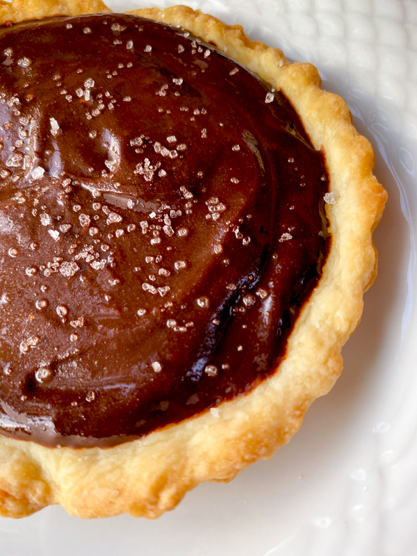To make the ganache, you make a deep caramel (sugar, melted – I added a pinch of salt here too) then pour hot cream over the top and pour that hot cream over chocolate to melt it. That gets poured into a fully-baked tart shell (I had pastry leftover from my first online cooking club of the year and made two individual tarts) and heads to the fridge for a while to set. I used semisweet chocolate as that’s what I had but think the caramel would work really well with milk chocolate too, per the recipe. Still not sold on the cinnamon đ so I sprinkled he top with a little fleur de sel and it was so good!