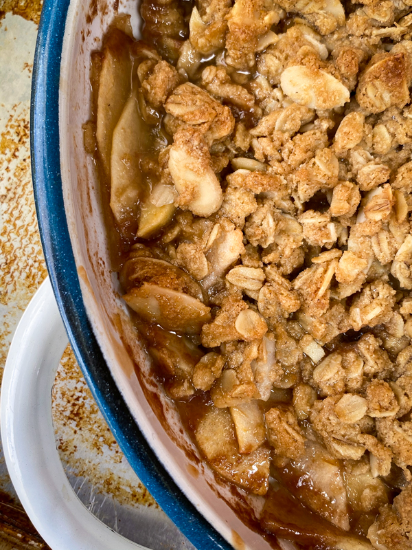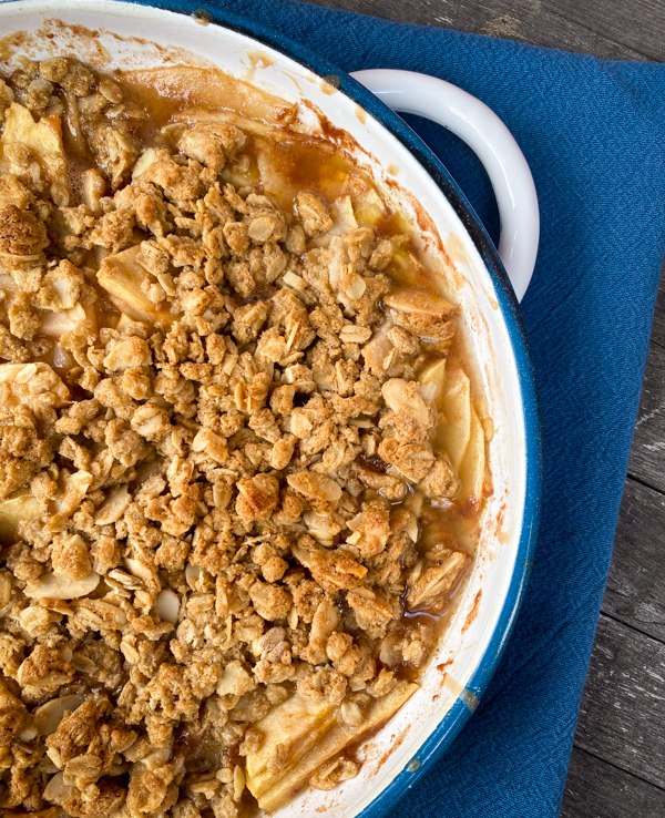 But not just any crumble – a Salted Caramel Apple Crumble where the apples cook in a bath of salted caramel sauce under a crispy crumble topping. A little bit extra effort to make the sauce yields a fancier crumble and, bonus – a pot of salted caramel spread for your breakfasts the following week!
