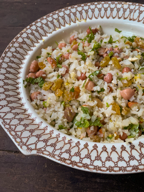 This is a lovely combination of bright flavours (and colours) – mint, cilantro and lemon zest/ juice really fancy up the cauliflower (really a blank canvas) and the raisins add a bit of sweetness. Some flaky sea salt and freshly ground black pepper finish the dish. So easy and yes, SO delicious!