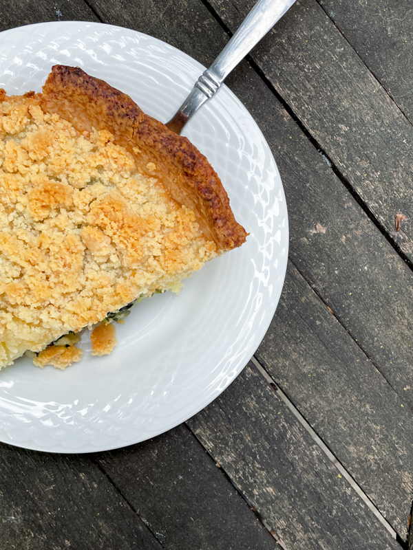 I was a little worried about this dish to be honest, baking through a rough weekend and my heart was not in it. Sometimes when we bake and we’re not in the right mindset, it comes through in the baked goods and they don’t turn out as well as they should. This turned out better than I expected – because I made each component separately (the pastry and spinach filling the day before, the crumble the morning of). And voilà, it actually held together beautifully: