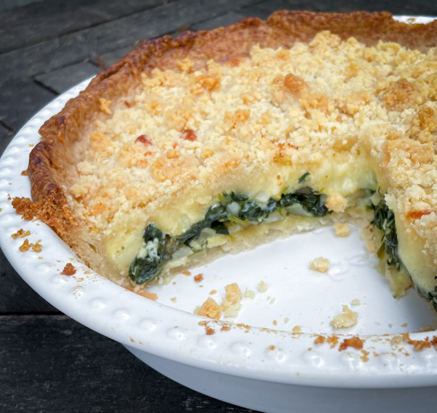 Get the recipe for Spinach-Mozzarella Pie with Parm Crumble on p 325 of Baking with Dorie or here.