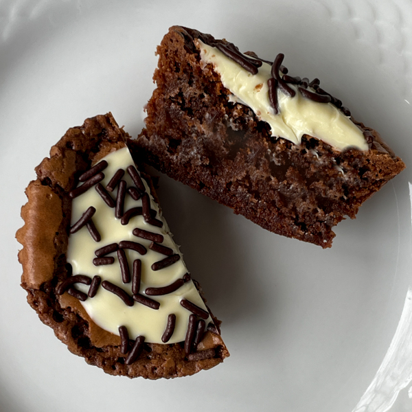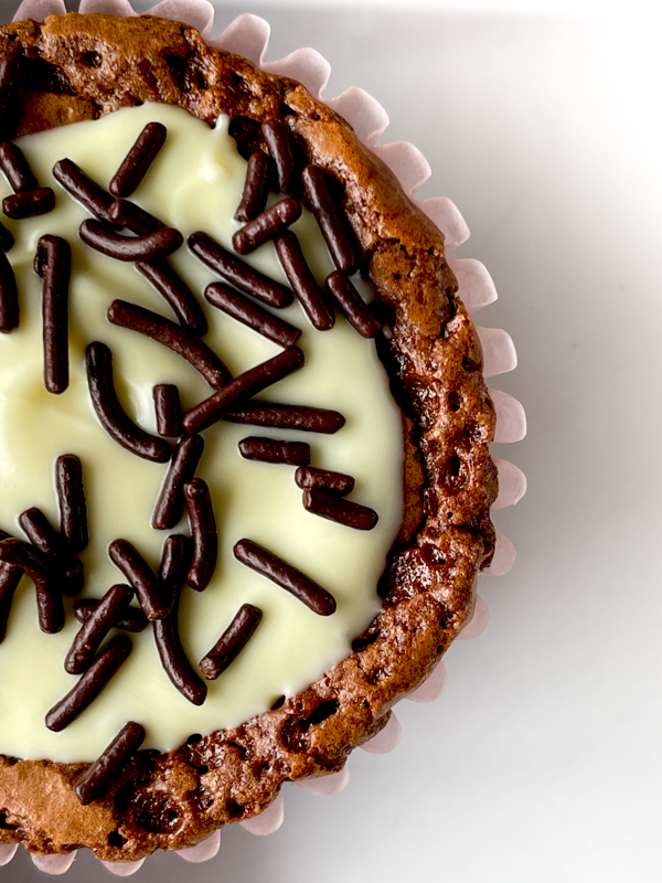 This is a light cupcake that kind of melts in your mouth and then the chewy brownie quality hits you. I love the crunch of the little disk of chocolate and sprinkles to counter the fudgey cake here.