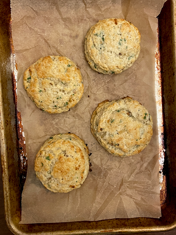 This week’s recipe includes instant mashed potato flakes, some herbs, and Parmesan and as I was making them, I spotted the vegetarian chili thawing on the countertop and immediately knew how I would serve these biscuits – topped with chili for a riff on a baked potato topped with chili!