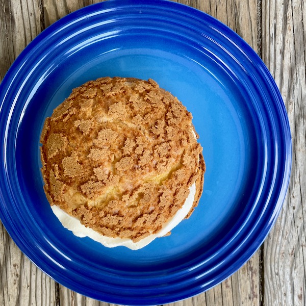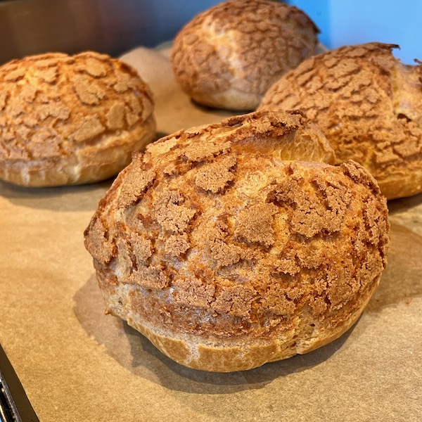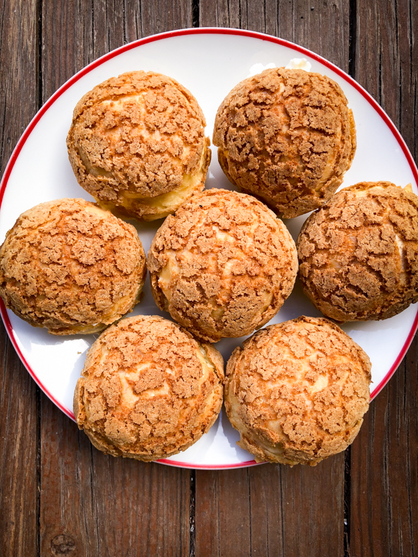 This week I chose to make the Cream Puffs with Crackle and Cream – basically a version of a cream puff/ profiterole that has become quite popular in Paris over the past few years. Little choux pastry buns topped with a “craquelin” topping (like a sweet shortcrust dough or, in this case, a brown sugar butter cookie dough) that melts and melds to the top of the puff as it bakes. We’ve actually made these before – the version from Baking with Dorie – back in 2019 and I forgot how much I love this version of cream puffs!