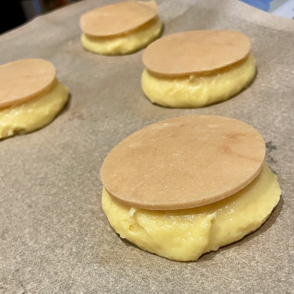I made this a birthday baking project this time around and made 1/2 the recipe to make 4 rather large choux buns (think – small hamburger size). These days I use a cookie scoop to portion my choux pastry. Mostly I use smaller ones such as these (<<< affiliate link but I love my cookie scoops!) but this time I used a larger one, size 12, approx. 2.5 inches in diameter (<<<affiliate link again).