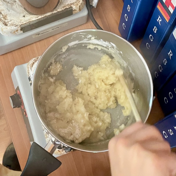 - Stir the mixture vigorously and continuously with a wooden spoon—it will come together fairly quickly, looking a little like mashed potatoes. Keep stirring over medium-low heat until it forms a smooth ball of dough, about 4 minutes. There might be a slight crust on the bottom of the pot, but that’s fine!