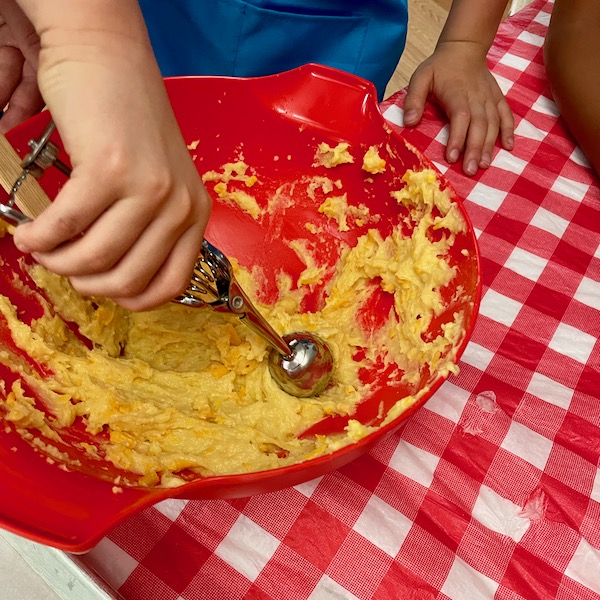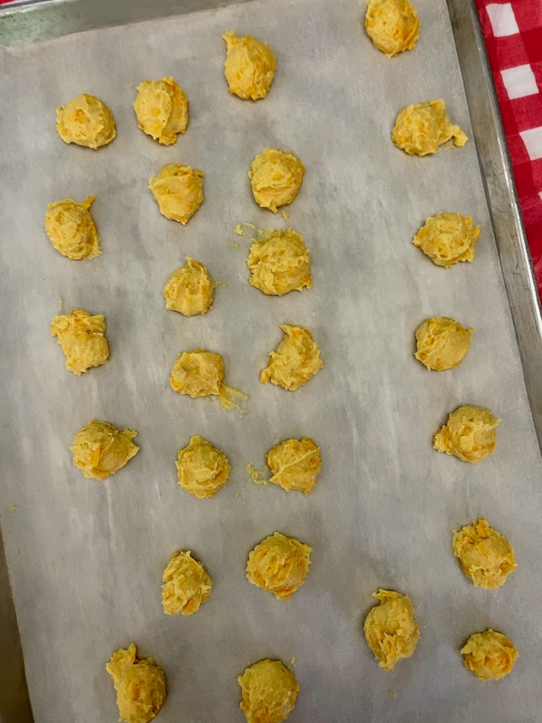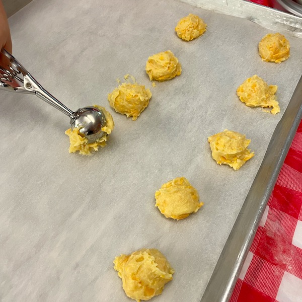 And once you’ve incorporated all the eggs, if you’re making gougères, fold in that cheese and scoop!