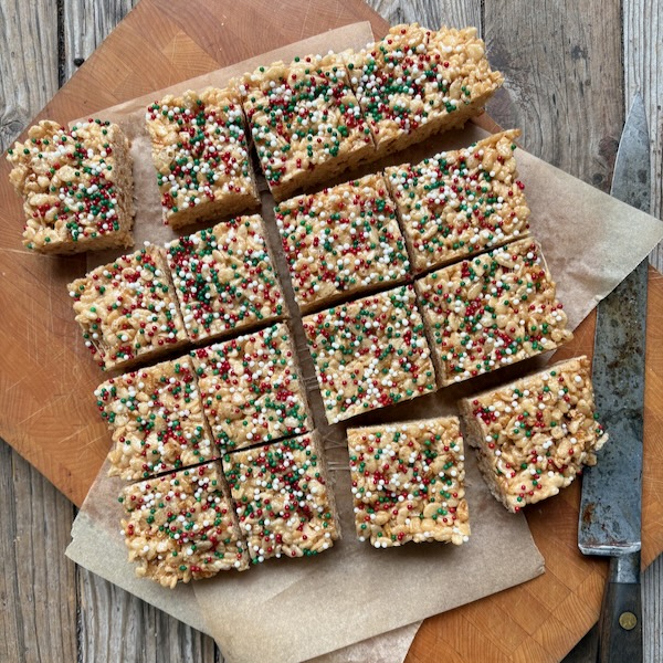 This year, I started working on these recipes in October (see: brain recovery = fatigue and everything taking so much longer than it used to) so I’ve made a few iterations of each of these recipes. Today’s treat is one, though, that I’ve made a bunch of times over the past few years – it was a favourite pandemic “bake” as we have a couple of gluten-free friends who we saw nearly every Friday night (either on Zoom or outside) in 2020 and 2021 and there were always snacks involved that catered to everyone’s needs/ tastes. Rice Krispie Treats were nearly always on the table!