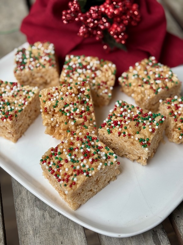 Rice Krispie Treats made with browned butter and holiday sprinkles!