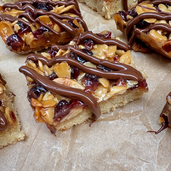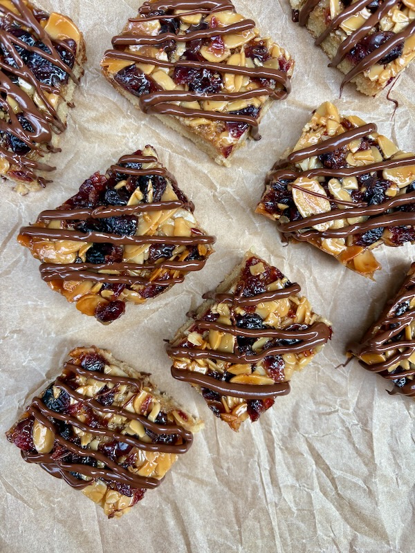 Today’s treat is a bit of a riff on a Florentine (I’ve made that for this series, way back in 2019 – see Giant Florentine Cookie (to share)!) – all the goodness of a Florentine (nuts, fruit, chocolate, caramel) only easier to make and used to top a soft cakey base.